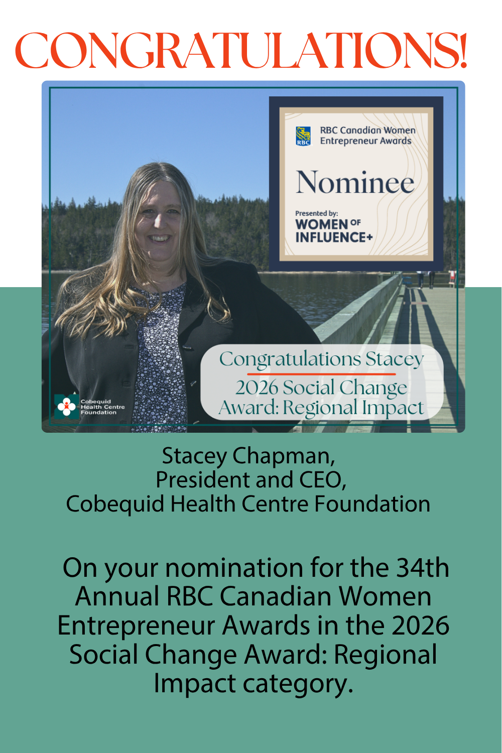 We are proud to share that Stacey Chapman, President and CEO of the Cobequid Health Centre Foundation, has been nominated for the 34th Annual RBC Canadian Women Entrepreneur Awards in the 2026 Social Change Award: Regional Impact category.